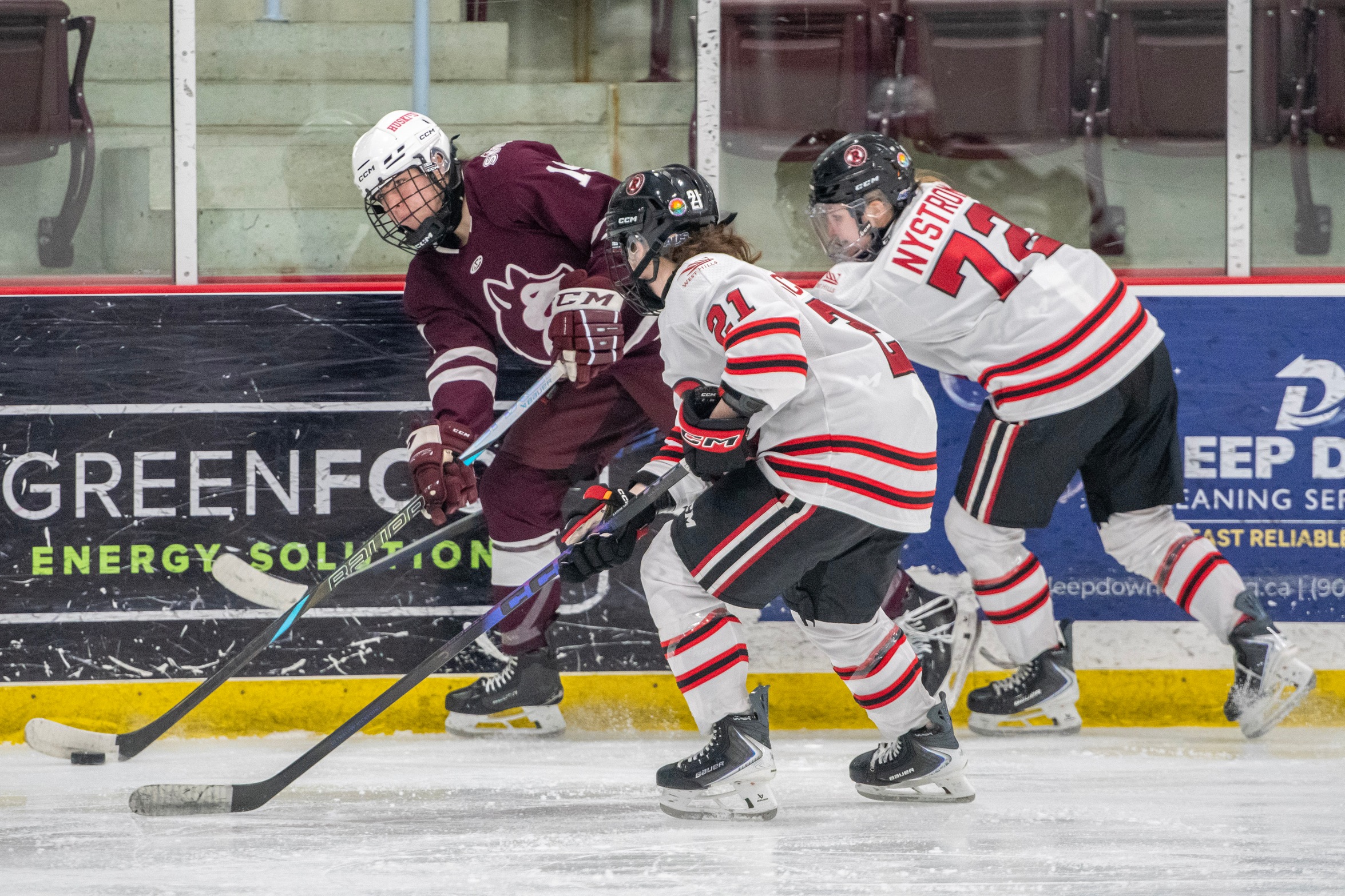 The Huskies pushed to cut into the lead, and got one back with under two minutes left. After pulling Hansen from goal, the puck came out of a crowd onto the stick of forward Mia Faseruk (Winnipeg, MB) who fired a point shot that beat McCallum to cut the lead to 3-2, with 1:46 remaining.