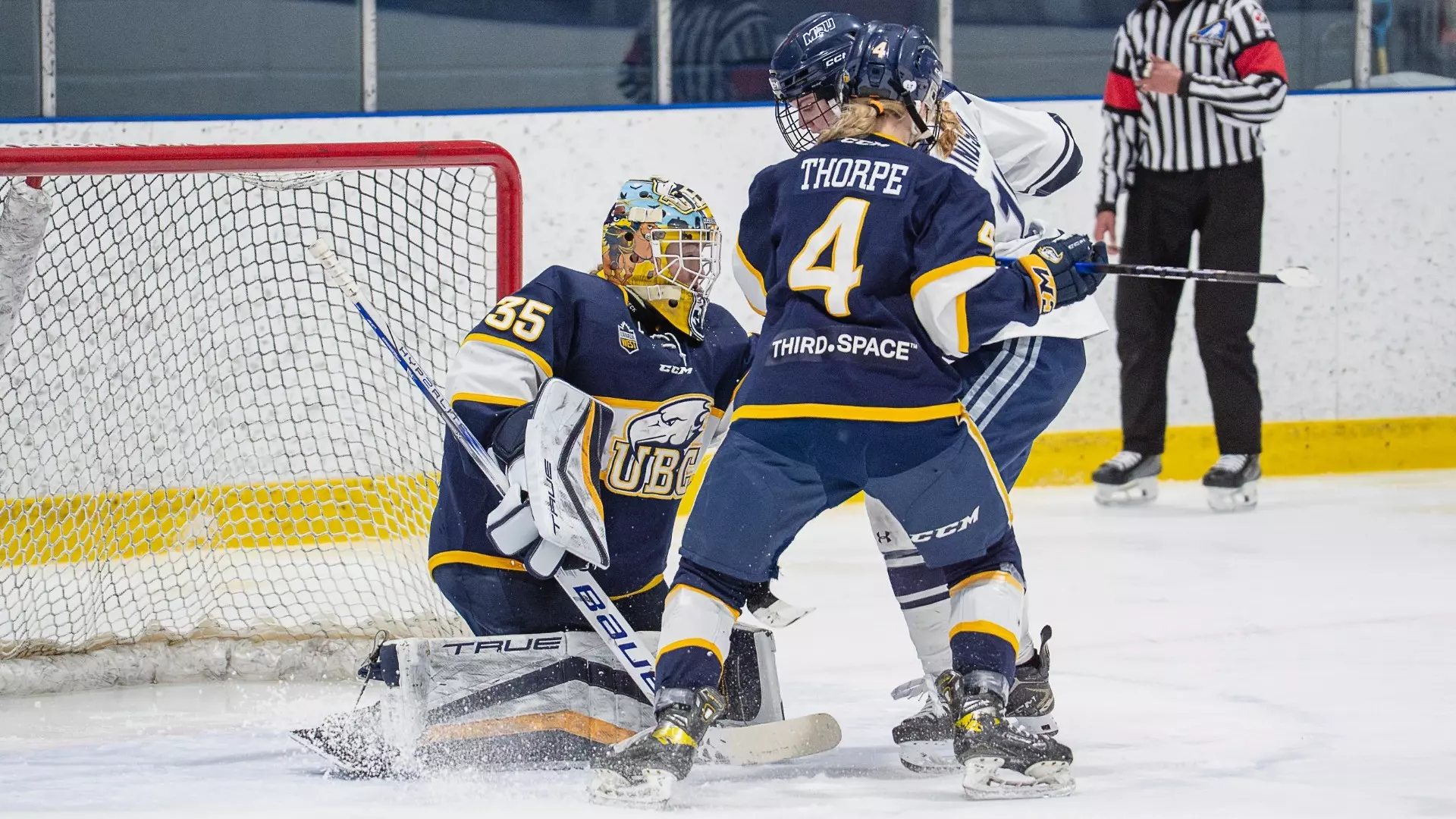 Jenna Goertzen stopped 15 shots in her season debut Friday as the Bisons stifled Saskatchewan attack to tighten the race for third place in the Canada West East Division.