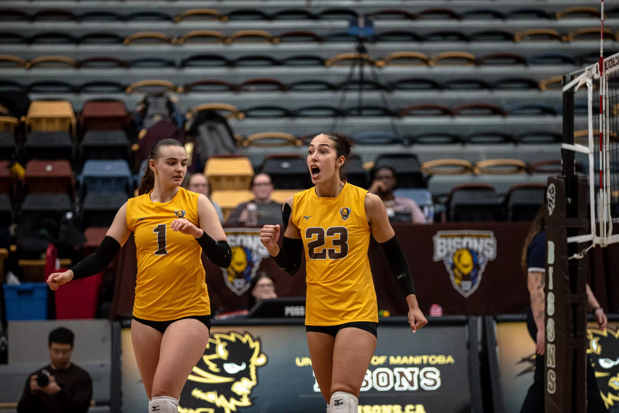 WINNIPEG – Middle Eve Catojo and left side Raya Surinx both made history on Friday night, setting school records (rally scoring era) in career regular season blocks and career regular season aces, respectively, helping Manitoba to a 3-1 win (23-25, 25-15, 25-19, 25-23) over Mount Royal.